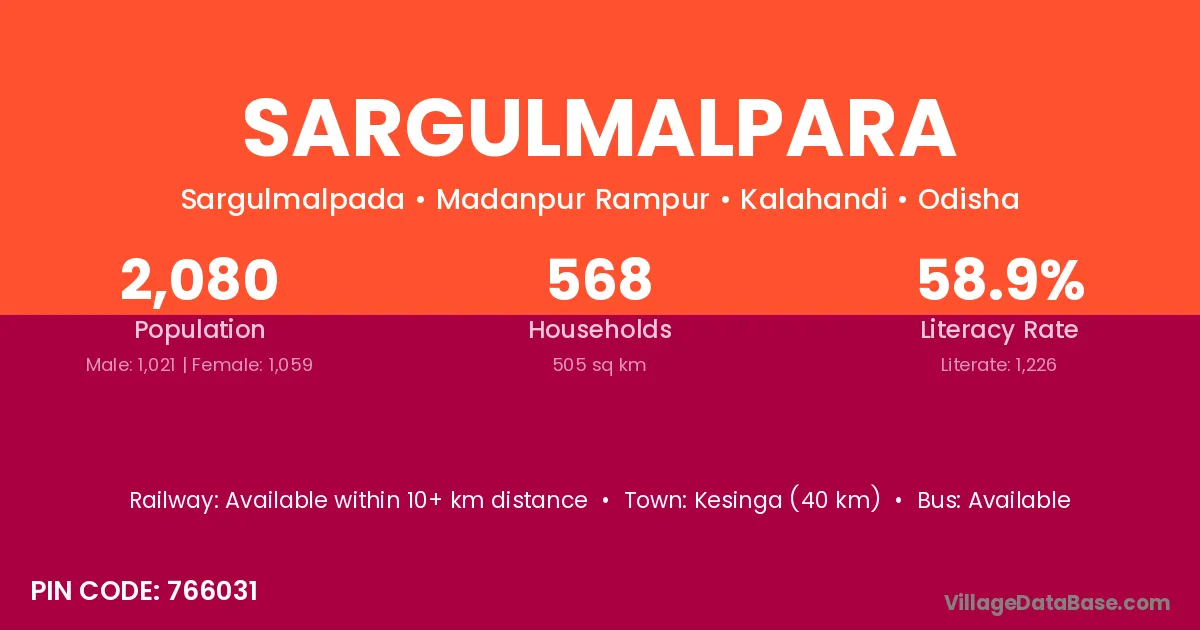 Kesinga (40 km) is the nearest town to Sargulmalpara village for major economic activities and is located approximately 40 km away.