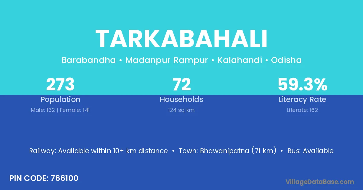 Bhawanipatna (71 km) is the nearest town to Tarkabahali village for major economic activities and is located approximately 71 km away.