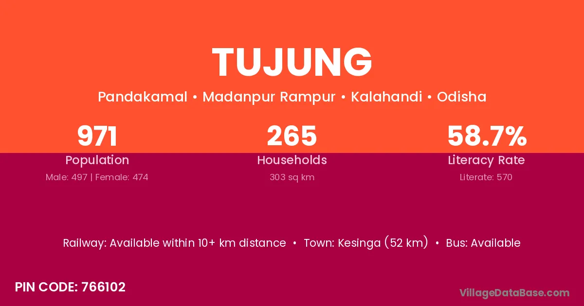 Kesinga (52 km) is the nearest town to Tujung village for major economic activities and is located approximately 52 km away.