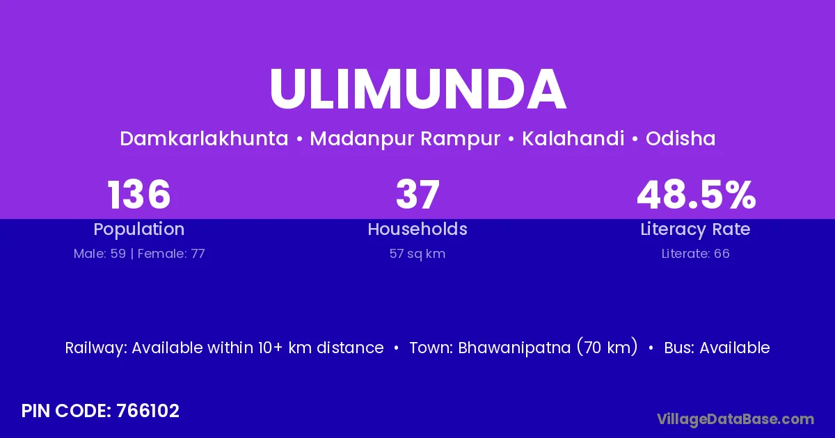Bhawanipatna (70 km) is the nearest town to Ulimunda village for major economic activities and is located approximately 70 km away.