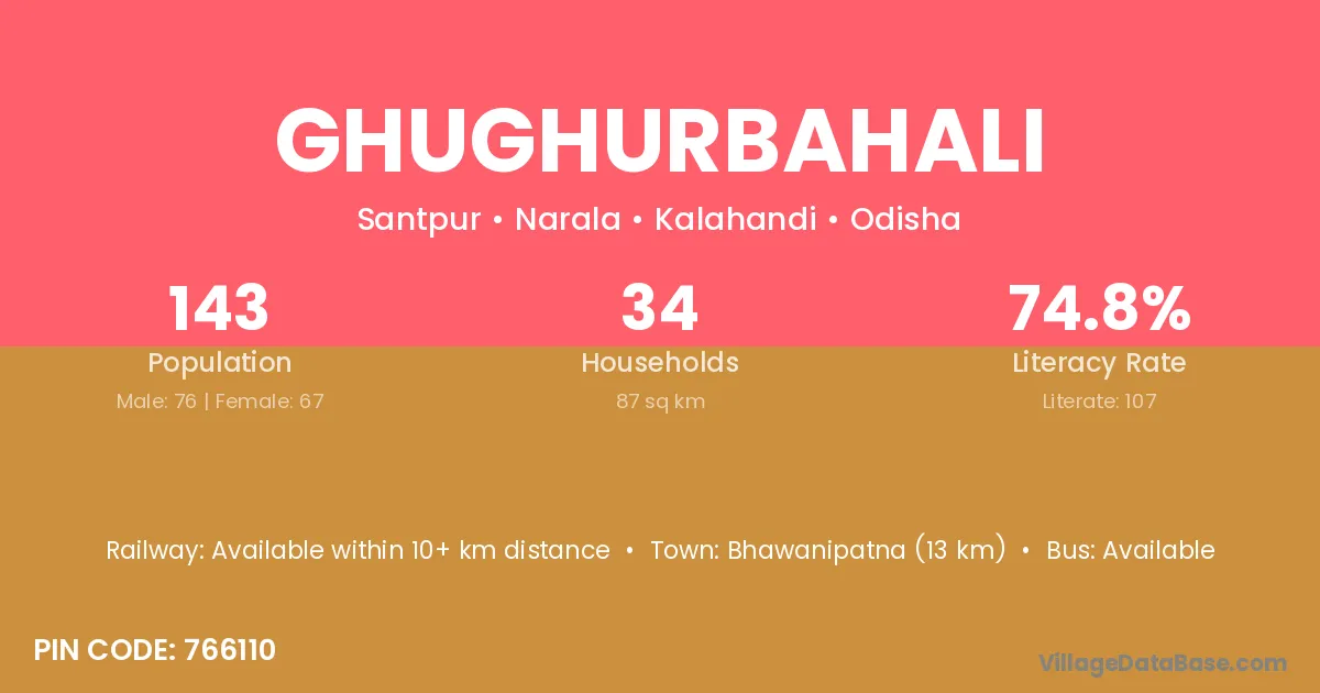 Bhawanipatna (13 km) is the nearest town to Ghughurbahali village for major economic activities and is located approximately 13 km away.