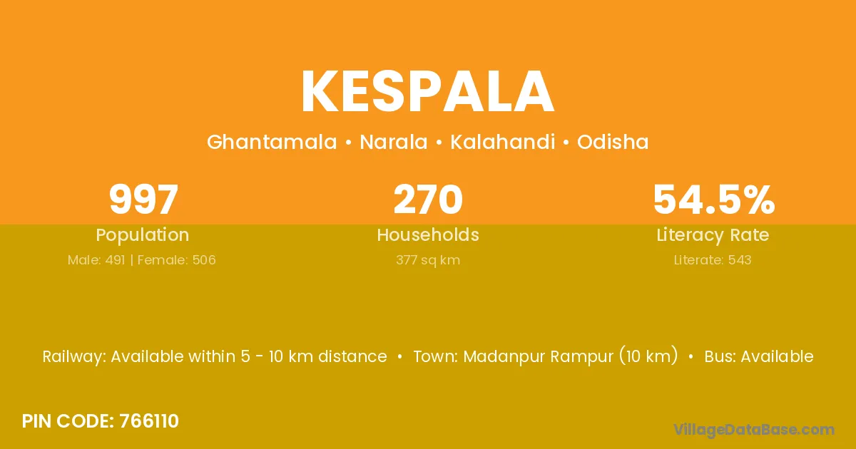 Kespala village has a total population of 997 people, of which 491 are males and 506 are females.