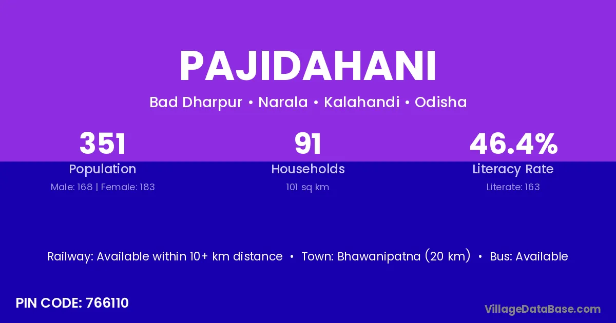 Bhawanipatna (20 km) is the nearest town to Pajidahani village for major economic activities and is located approximately 20 km away.