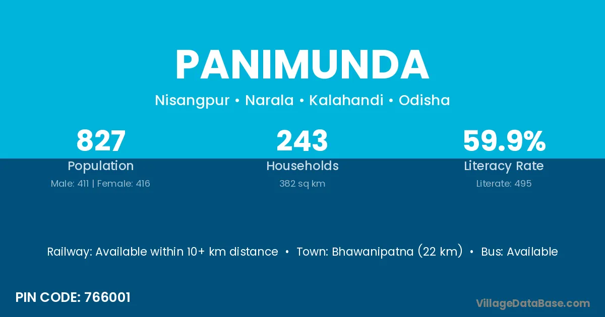 Bhawanipatna (22 km) is the nearest town to Panimunda village for major economic activities and is located approximately 22 km away.
