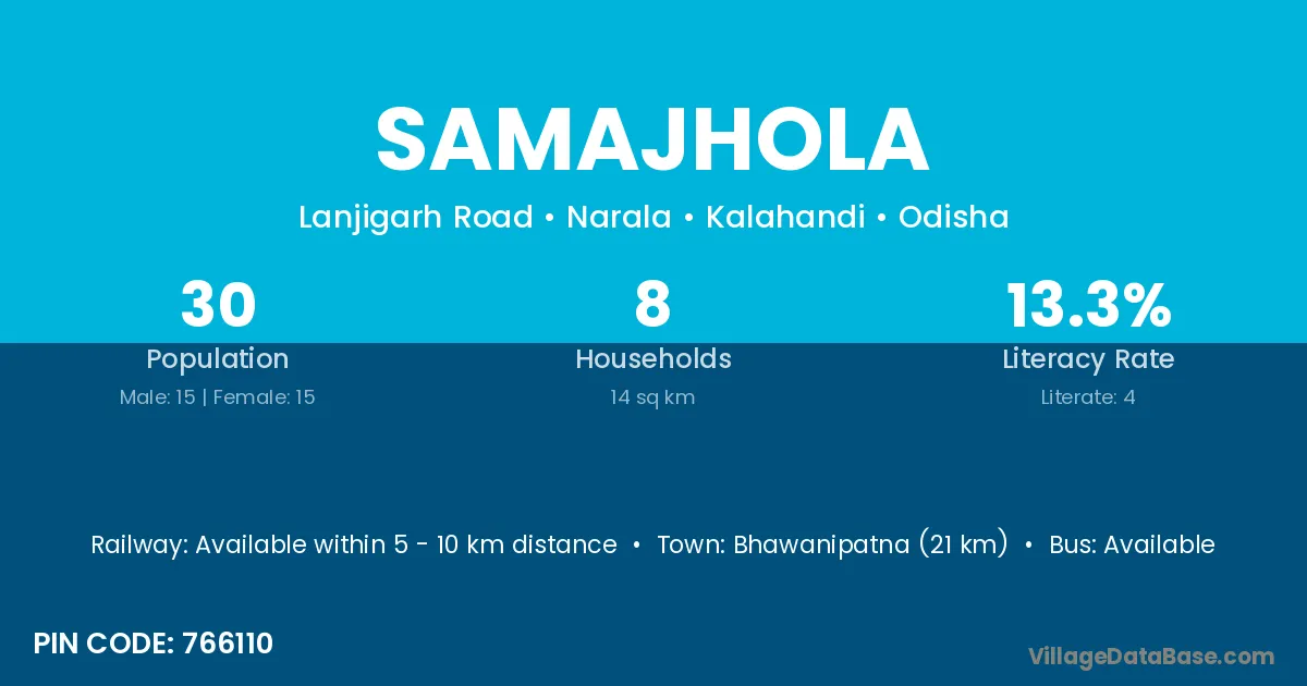 Bhawanipatna (21 km) is the nearest town to Samajhola village for major economic activities and is located approximately 21 km away.