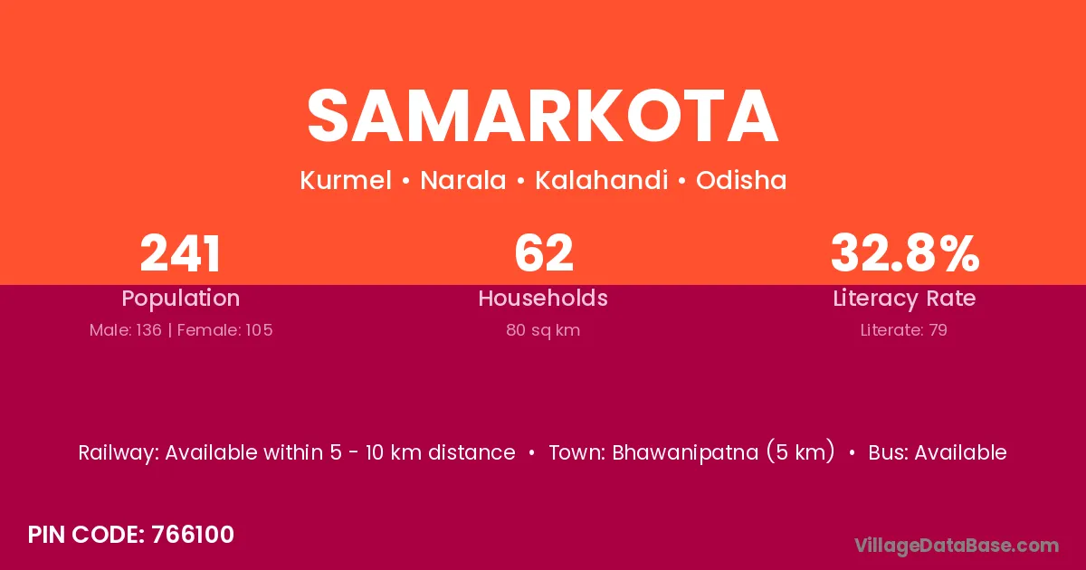 Bhawanipatna (5 km) is the nearest town to Samarkota village for major economic activities and is located approximately 5 km away.