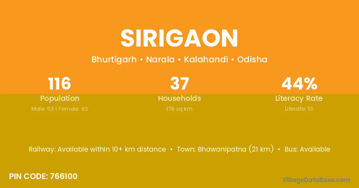 Bhawanipatna (21 km) is the nearest town to Sirigaon village for major economic activities and is located approximately 21 km away.