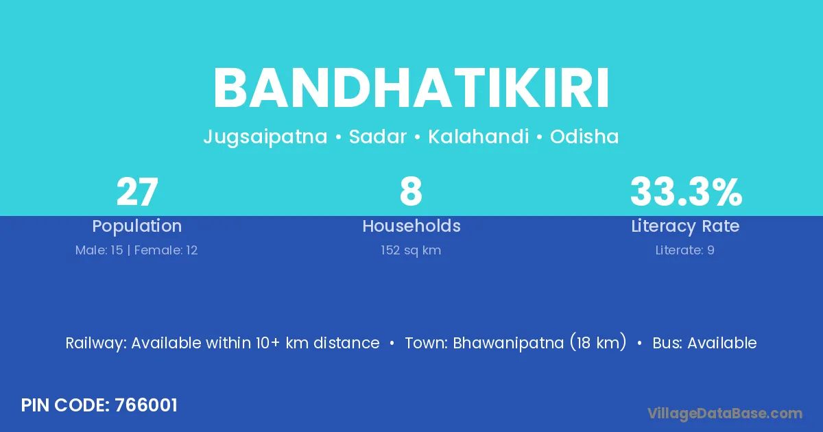 Bhawanipatna (18 km) is the nearest town to Bandhatikiri village for major economic activities and is located approximately 18 km away.