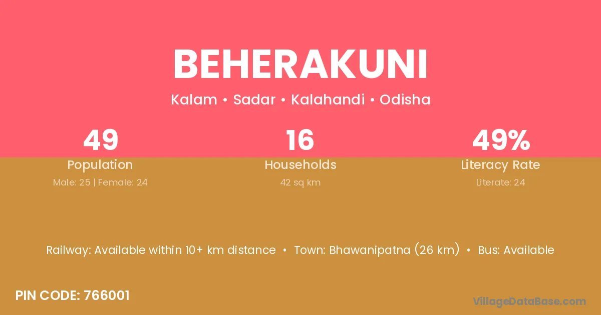 Bhawanipatna (26 km) is the nearest town to Beherakuni village for major economic activities and is located approximately 26 km away.
