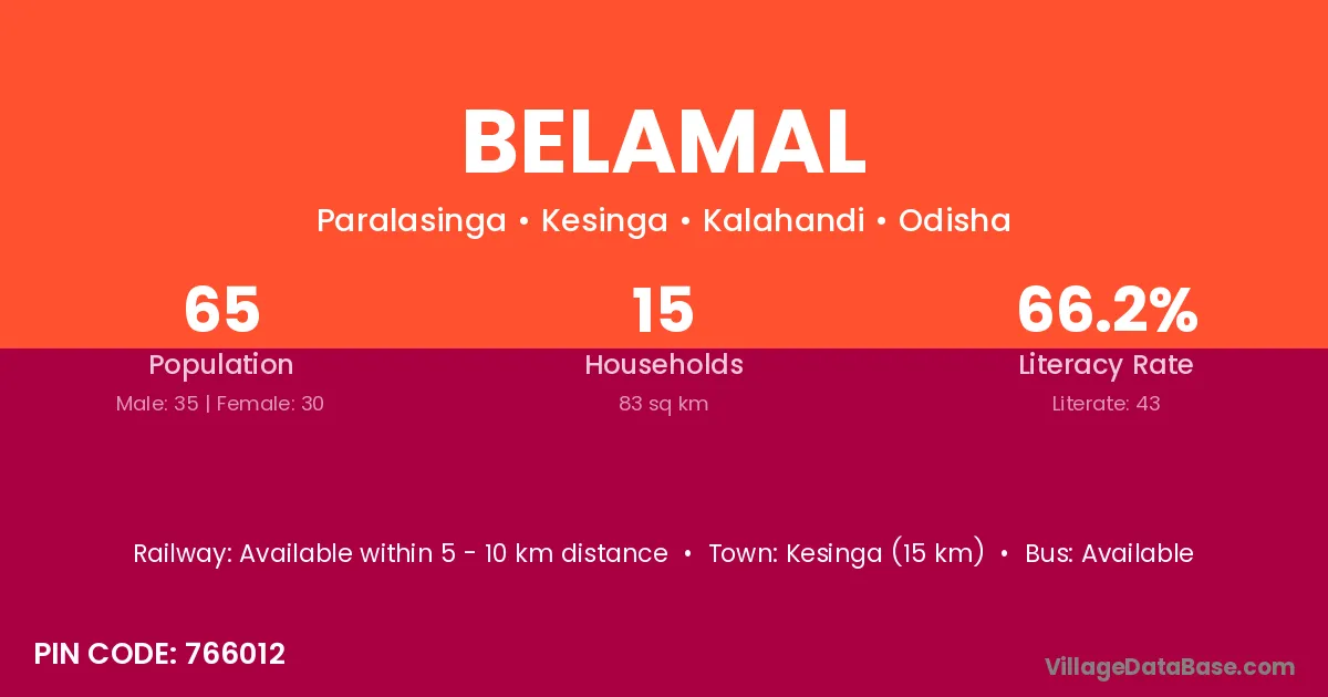 Bhawanipatna (11 km) is the nearest town to Belamal village for major economic activities and is located approximately 11 km away.