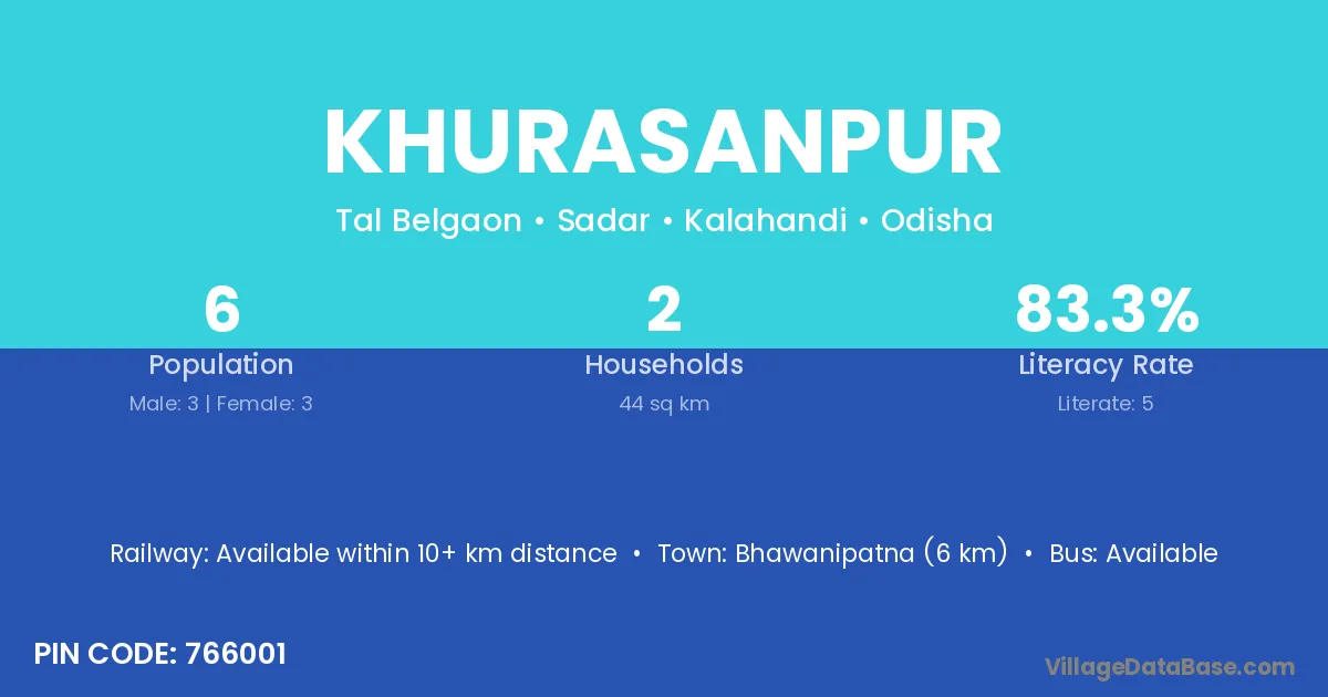 Bhawanipatna (6 km) is the nearest town to Khurasanpur village for major economic activities and is located approximately 6 km away.