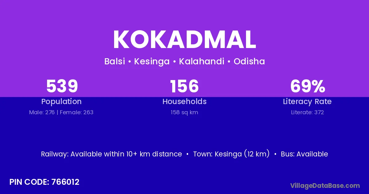 Kesinga (11 km) is the nearest town to Kokadmal village for major economic activities and is located approximately 11 km away.