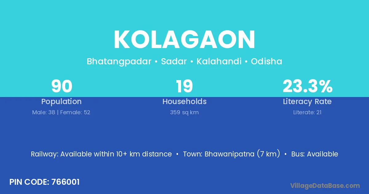 Bhawanipatna (7 km) is the nearest town to Kolagaon village for major economic activities and is located approximately 7 km away.