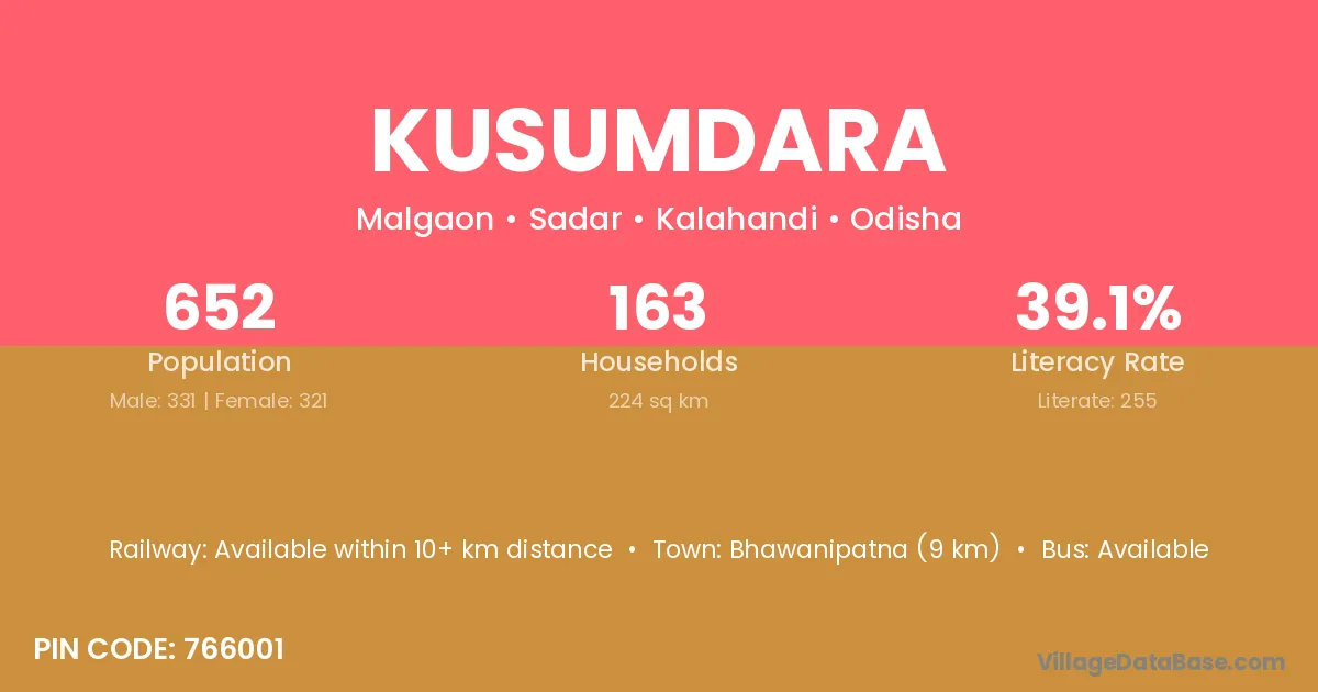 Bhawanipatna (9 km) is the nearest town to Kusumdara village for major economic activities and is located approximately 9 km away.