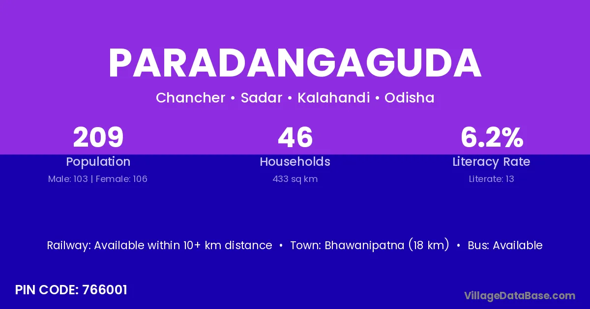Bhawanipatna (18 km) is the nearest town to Paradangaguda village for major economic activities and is located approximately 18 km away.