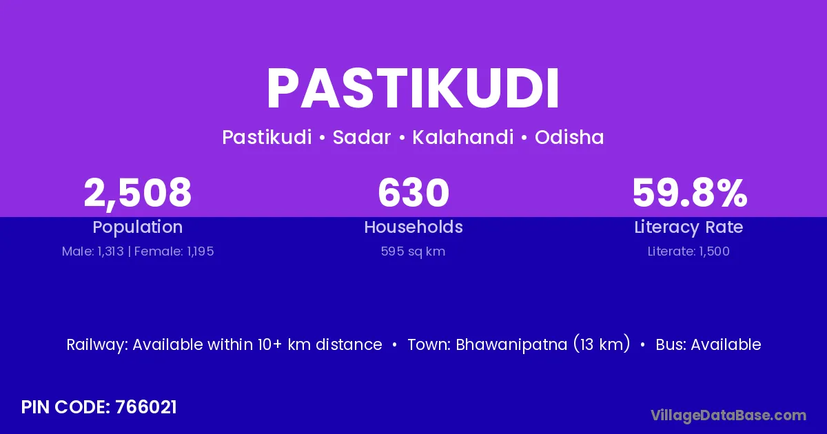 Bhawanipatna (13 km) is the nearest town to Pastikudi village for major economic activities and is located approximately 13 km away.