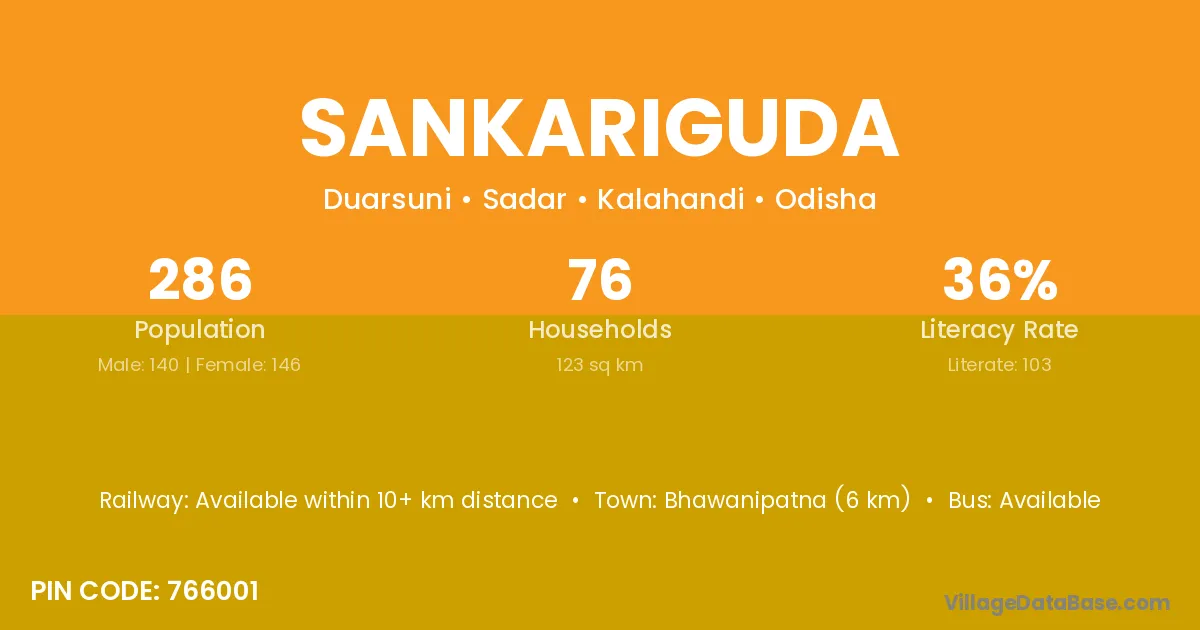 Bhawanipatna (6 km) is the nearest town to Sankariguda village for major economic activities and is located approximately 6 km away.