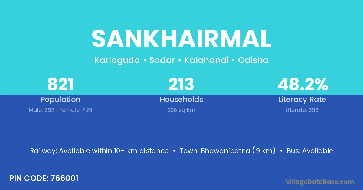 Bhawanipatna (9 km) is the nearest town to Sankhairmal village for major economic activities and is located approximately 9 km away.