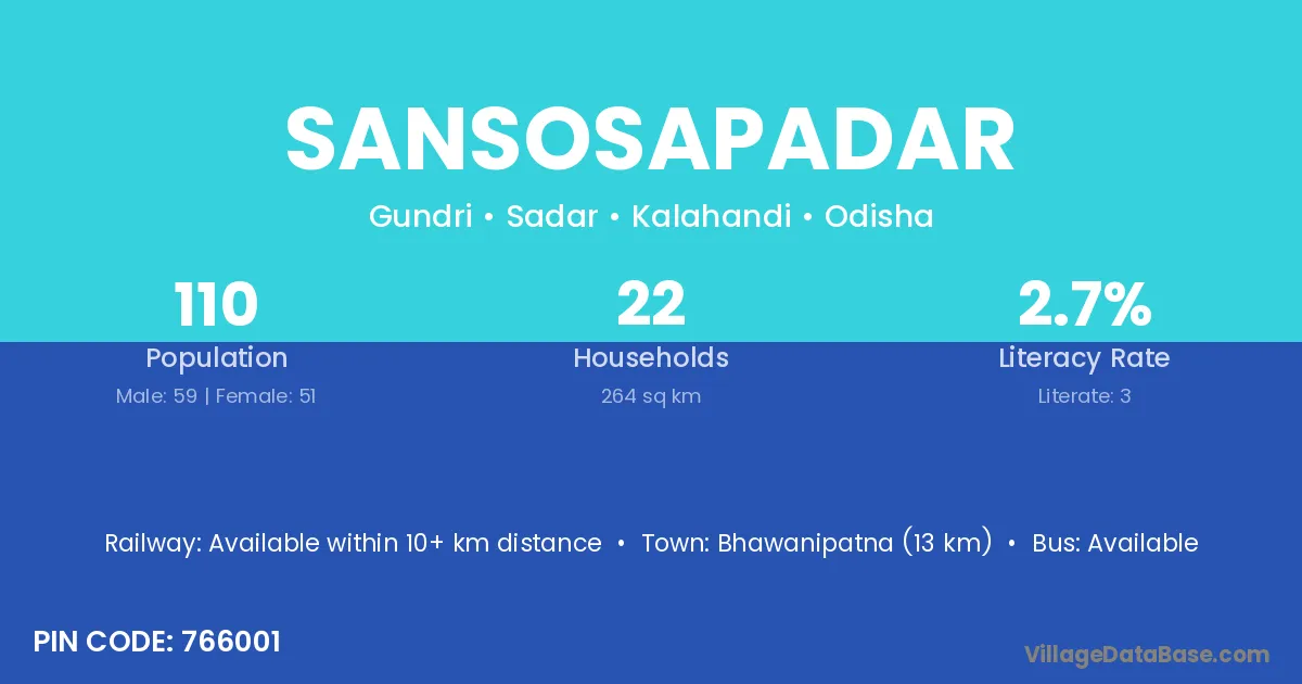Bhawanipatna (13 km) is the nearest town to Sansosapadar village for major economic activities and is located approximately 13 km away.