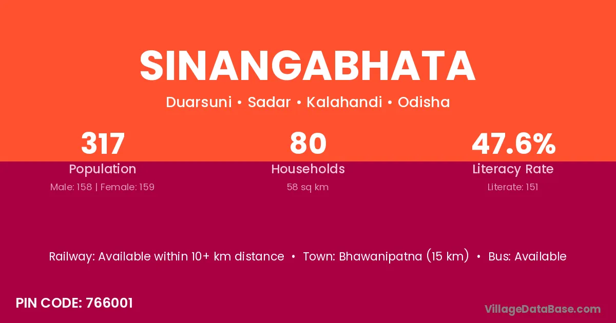 Bhawanipatna (15 km) is the nearest town to Sinangabhata village for major economic activities and is located approximately 15 km away.