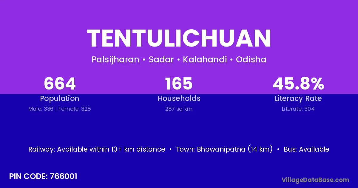 Bhawanipatna (14 km) is the nearest town to Tentulichuan village for major economic activities and is located approximately 14 km away.