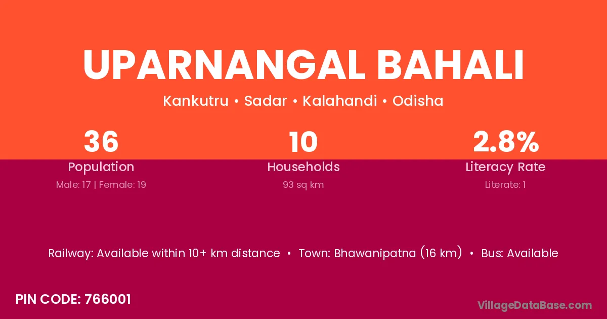 Bhawanipatna (16 km) is the nearest town to Uparnangal Bahali village for major economic activities and is located approximately 16 km away.