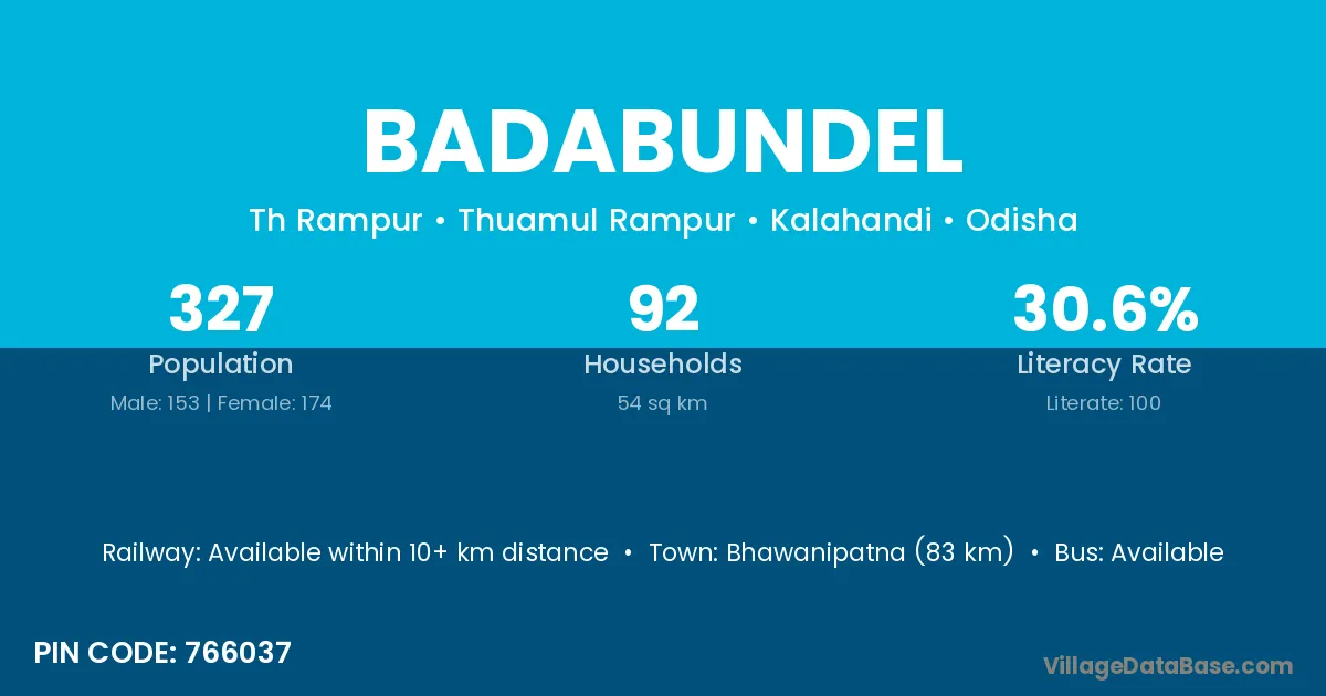 Bhawanipatna (83 km) is the nearest town to Badabundel village for major economic activities and is located approximately 83 km away.