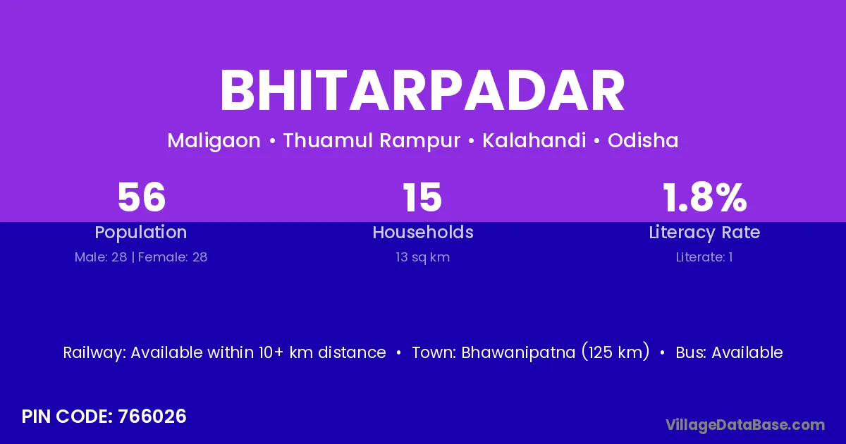 Bhawanipatna (125 km) is the nearest town to Bhitarpadar village for major economic activities and is located approximately 125 km away.