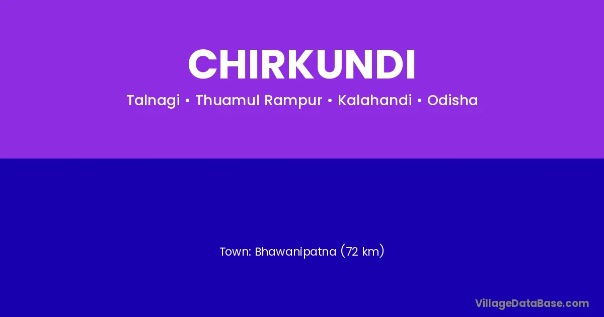 Bhawanipatna (72 km) is the nearest town to Chirkundi village for major economic activities and is located approximately 72 km away.