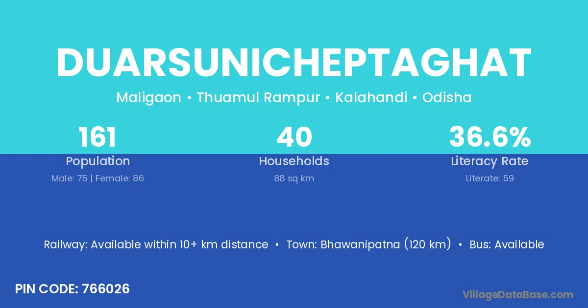 Bhawanipatna (120 km) is the nearest town to Duarsunicheptaghat village for major economic activities and is located approximately 120 km away.