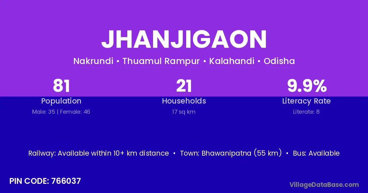 Bhawanipatna (55 km) is the nearest town to Jhanjigaon village for major economic activities and is located approximately 55 km away.