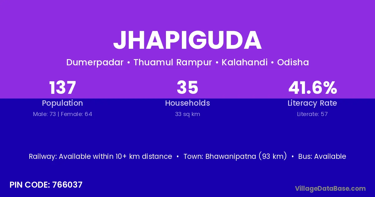 Bhawanipatna (93 km) is the nearest town to Jhapiguda village for major economic activities and is located approximately 93 km away.