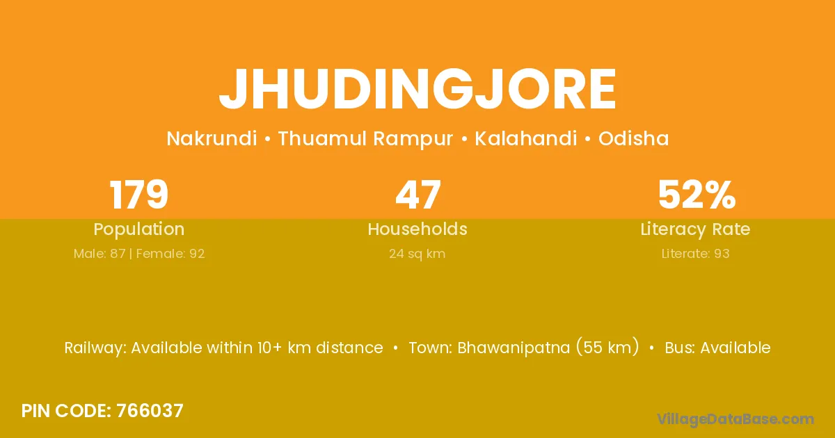 Bhawanipatna (55 km) is the nearest town to Jhudingjore village for major economic activities and is located approximately 55 km away.