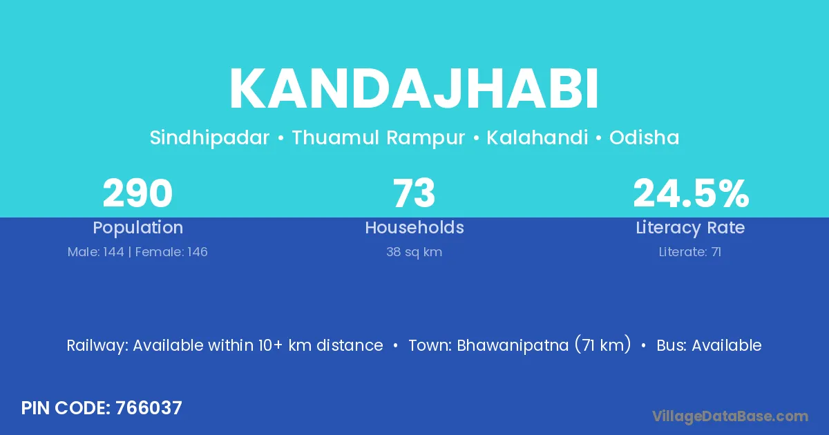 Bhawanipatna (71 km) is the nearest town to Kandajhabi village for major economic activities and is located approximately 71 km away.