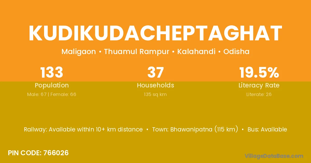 Bhawanipatna (115 km) is the nearest town to Kudikudacheptaghat village for major economic activities and is located approximately 115 km away.