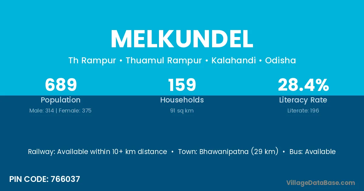 Bhawanipatna (29 km) is the nearest town to Melkundel village for major economic activities and is located approximately 29 km away.