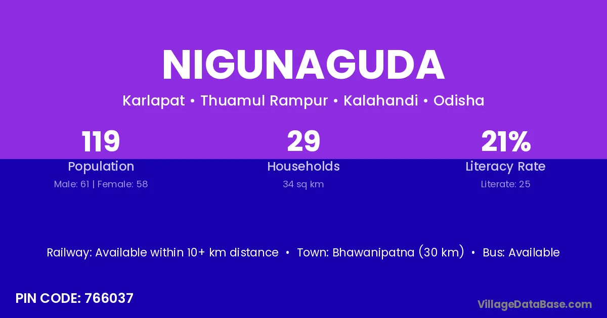 Bhawanipatna (30 km) is the nearest town to Nigunaguda village for major economic activities and is located approximately 30 km away.