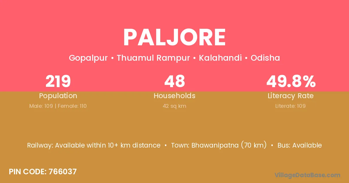 Bhawanipatna (70 km) is the nearest town to Paljore village for major economic activities and is located approximately 70 km away.
