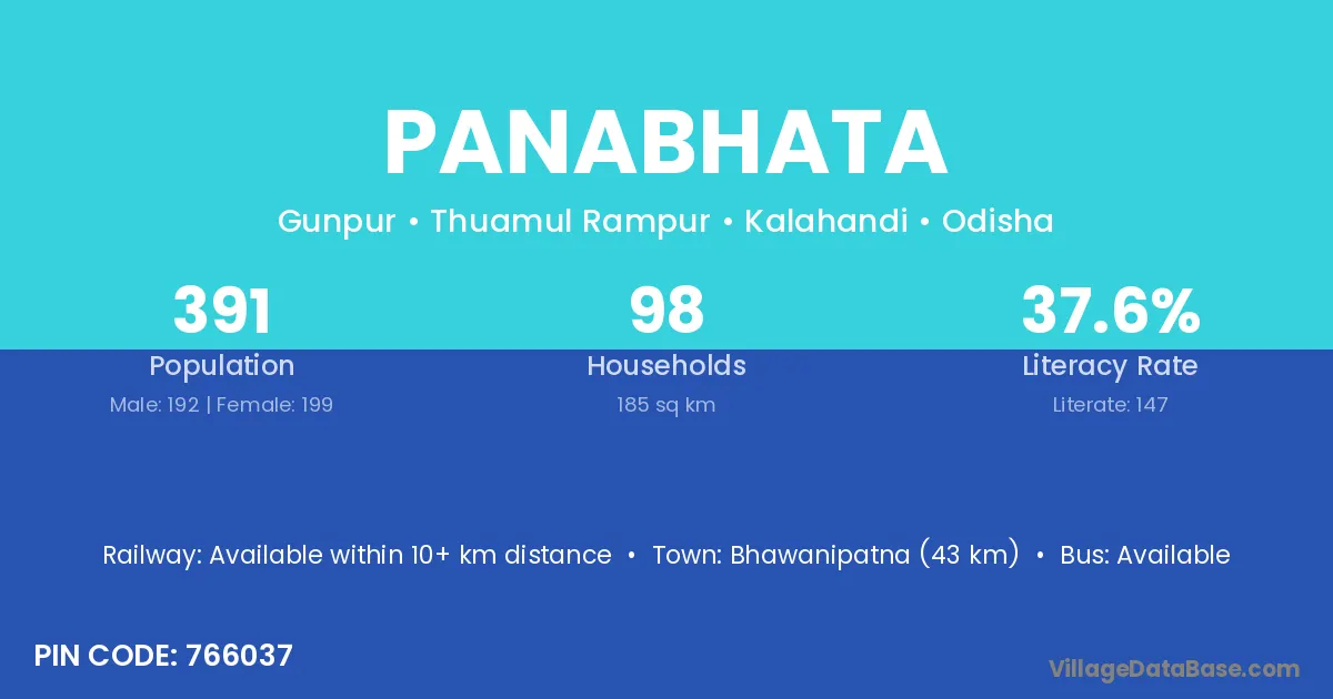 Bhawanipatna (43 km) is the nearest town to Panabhata village for major economic activities and is located approximately 43 km away.