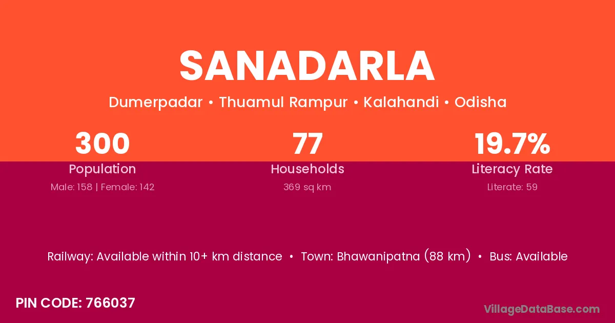 Bhawanipatna (88 km) is the nearest town to Sanadarla village for major economic activities and is located approximately 88 km away.