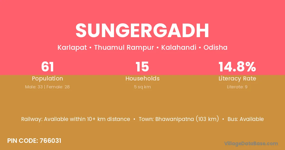 Bhawanipatna (103 km) is the nearest town to Sungergadh village for major economic activities and is located approximately 103 km away.