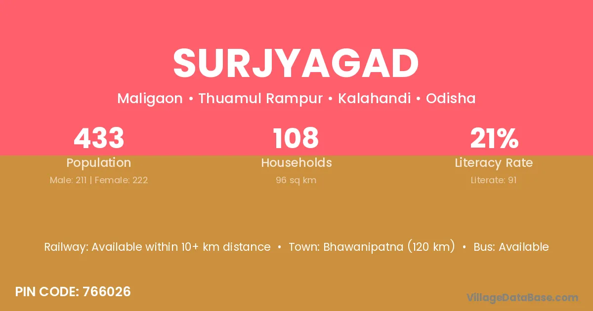Bhawanipatna (120 km) is the nearest town to Surjyagad village for major economic activities and is located approximately 120 km away.