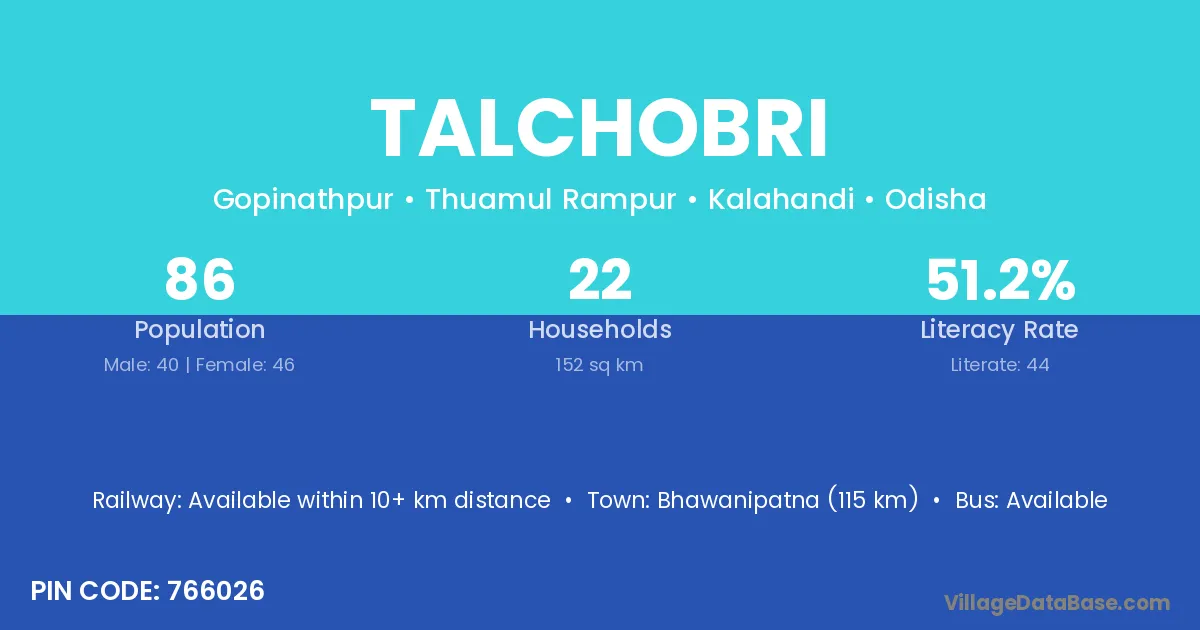 Bhawanipatna (115 km) is the nearest town to Talchobri village for major economic activities and is located approximately 115 km away.