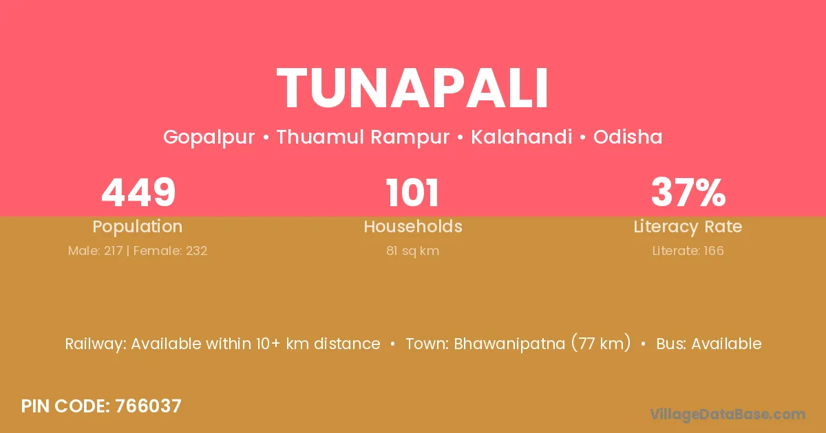 Tunapali village has a total population of 449 people, of which 217 are males and 232 are females.