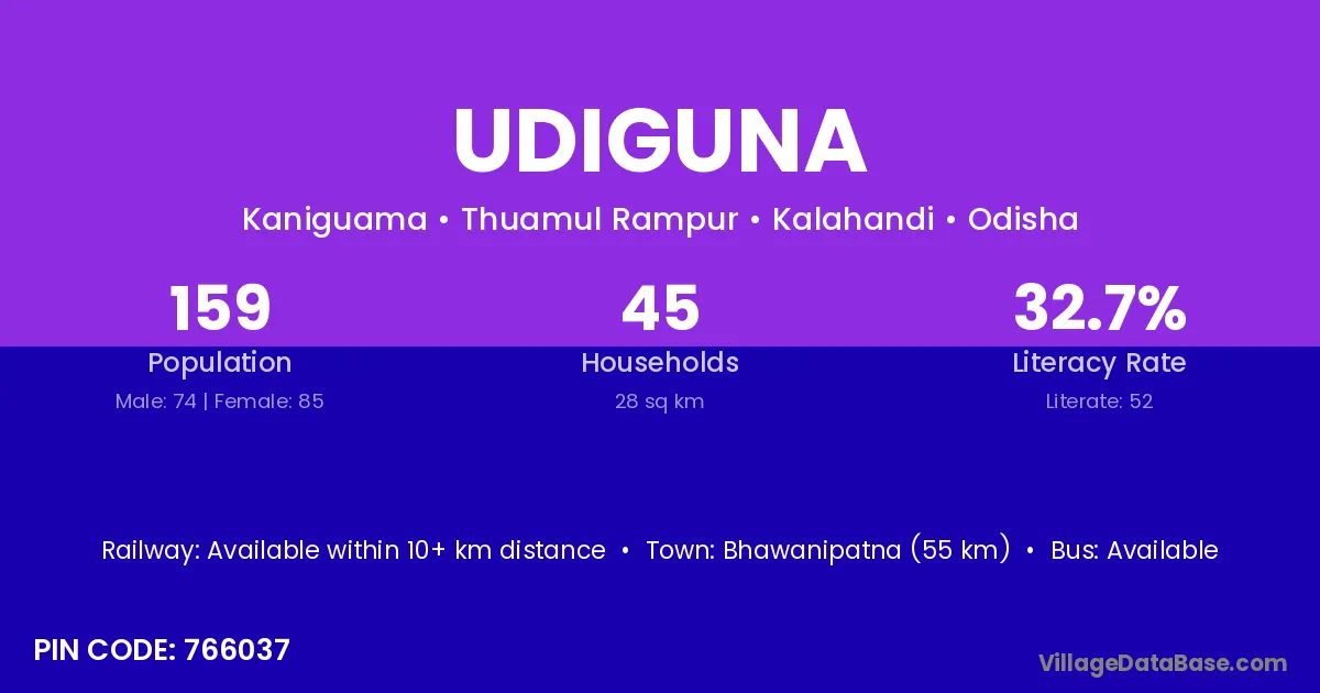 Bhawanipatna (55 km) is the nearest town to Udiguna village for major economic activities and is located approximately 55 km away.