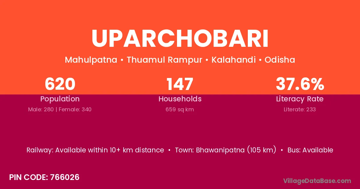 Bhawanipatna (105 km) is the nearest town to Uparchobari village for major economic activities and is located approximately 105 km away.