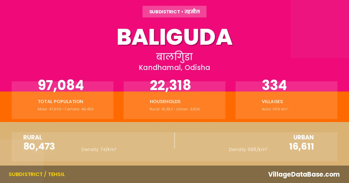 According to the 2011 census The total area of Baliguda Tehsil is 1106 km², with a population of 97084 people. The population density is 88 inhabitants per square kilometre, and there are approximately 22318 houses in the sub district.
