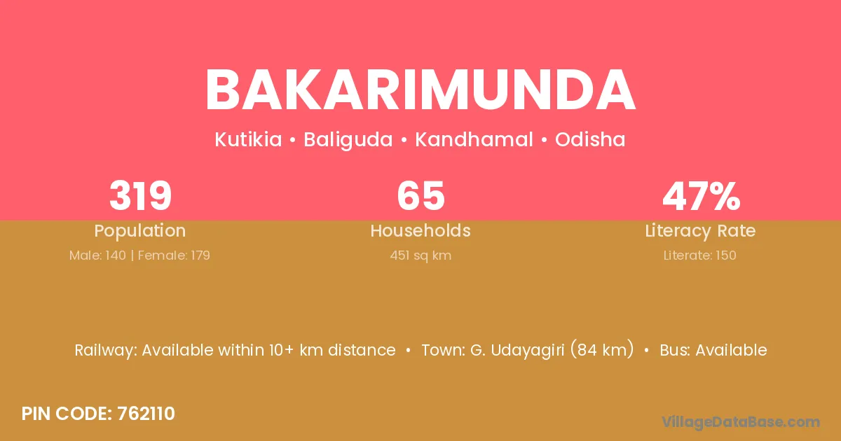G. Udayagiri (84 km) is the nearest town to Bakarimunda village for major economic activities and is located approximately 84 km away.