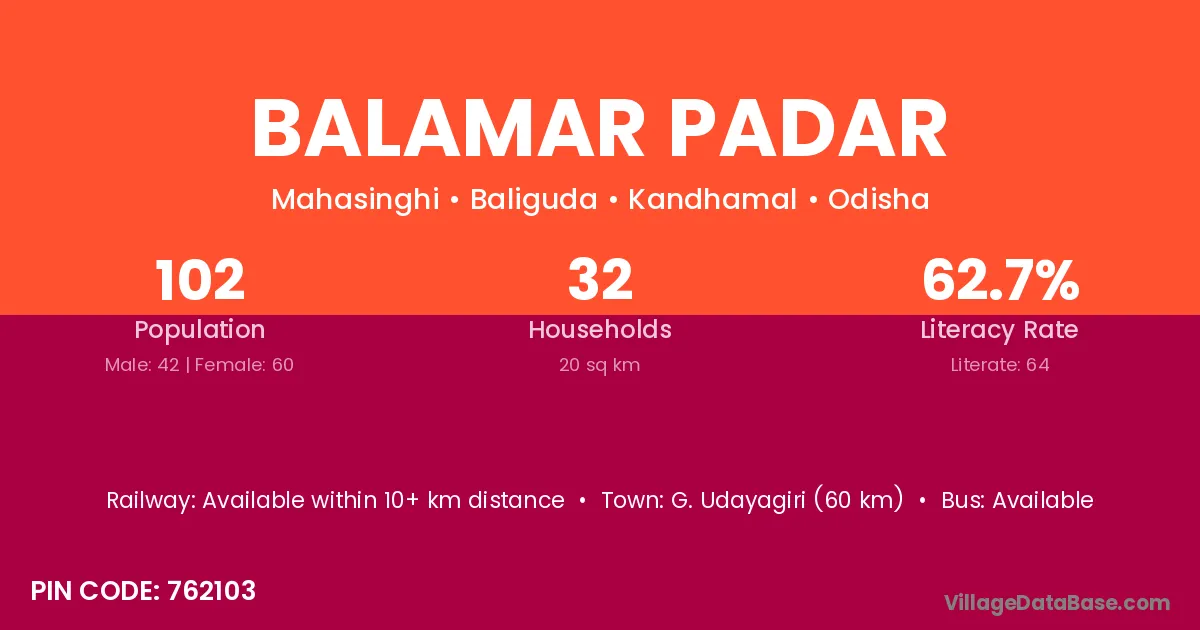 G. Udayagiri (60 km) is the nearest town to Balamar Padar village for major economic activities and is located approximately 60 km away.