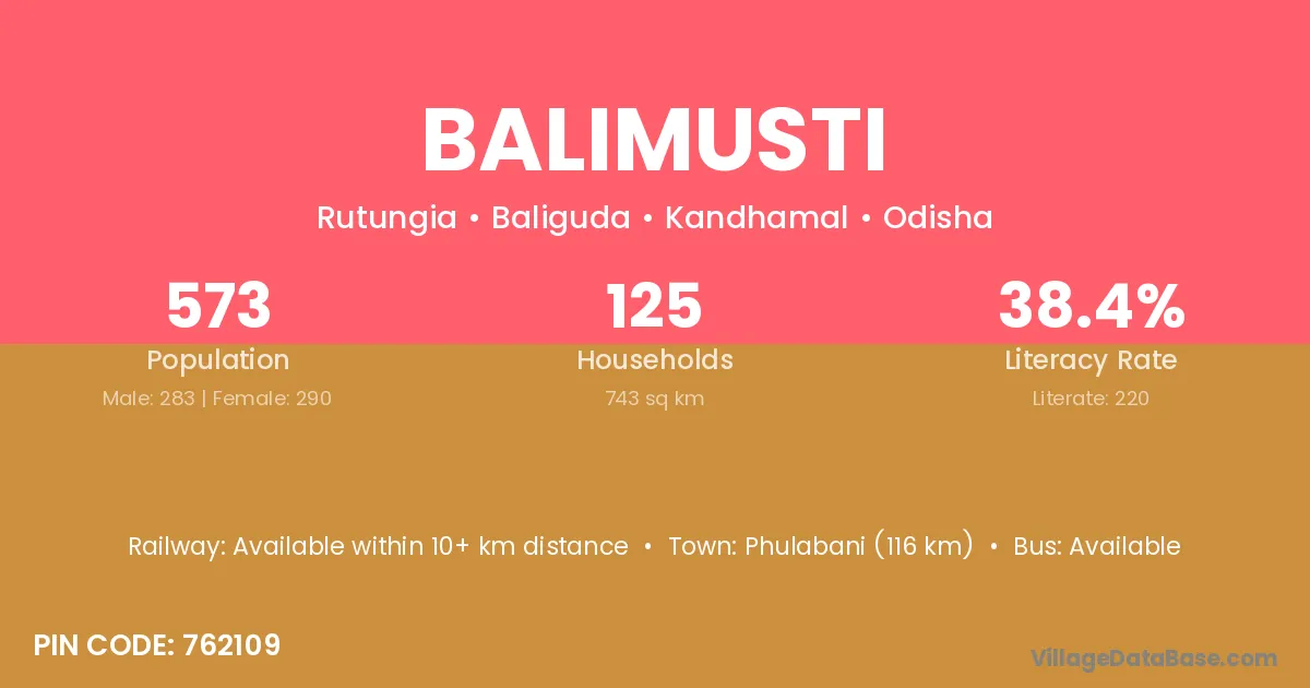 Phulabani (116 km) is the nearest town to Balimusti village for major economic activities and is located approximately 116 km away.